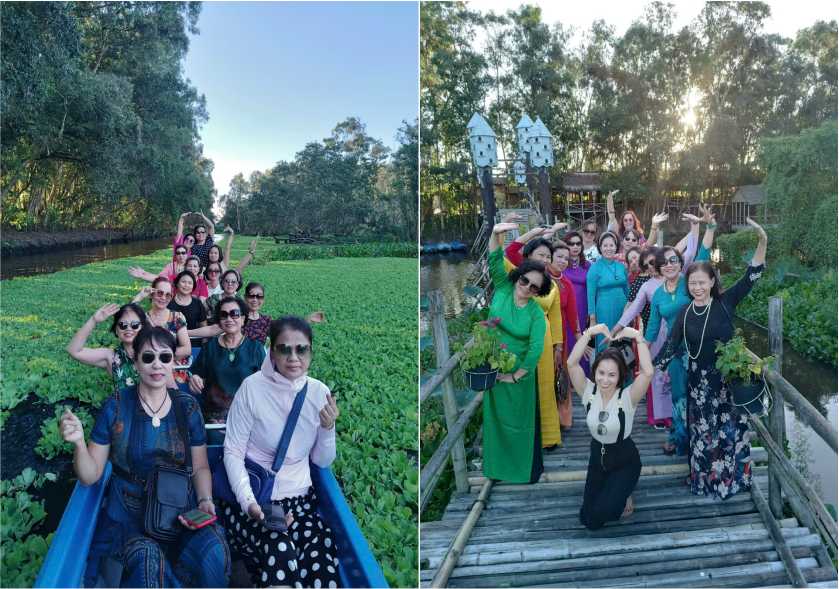 Ăn trưa | 1. Tép xào bông điên điển 2. Gà xào sả ớt 3. Trứng chiên hành 4. Rau luộc thẩm cẩm kho quẹt 5. Lẩu cá thát lát khổ qua 6. Cơm, trà đá, tráng miệng |