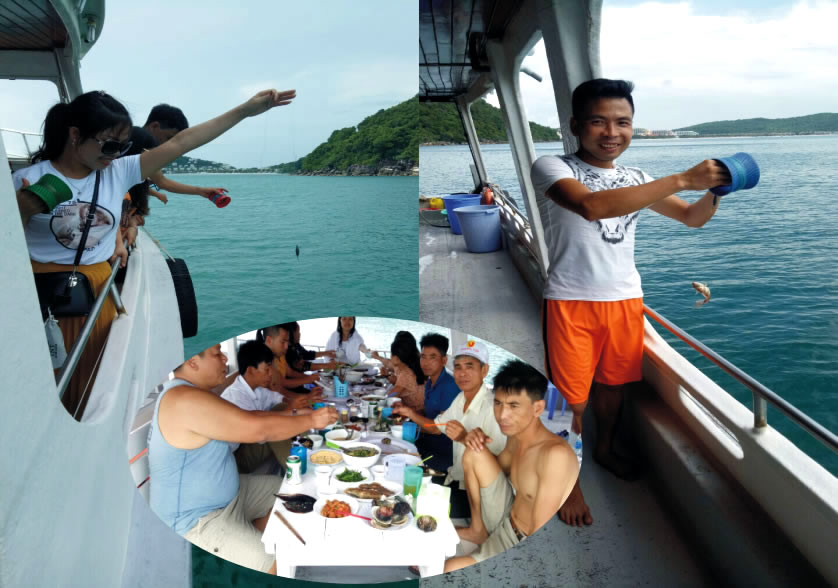 Ăn trưa | 1. Cá biển chưng tương/hấp xi dầu 2. Gỏi cá trích Phú Quốc 3. Tôm rang muối 4. Mực Phú Quốc hấp 5. Sườn rim mặn 6. Lẩu hải sản 7. Rau xào thập cẩm 8. Cơm, trà đá, tráng miệng |